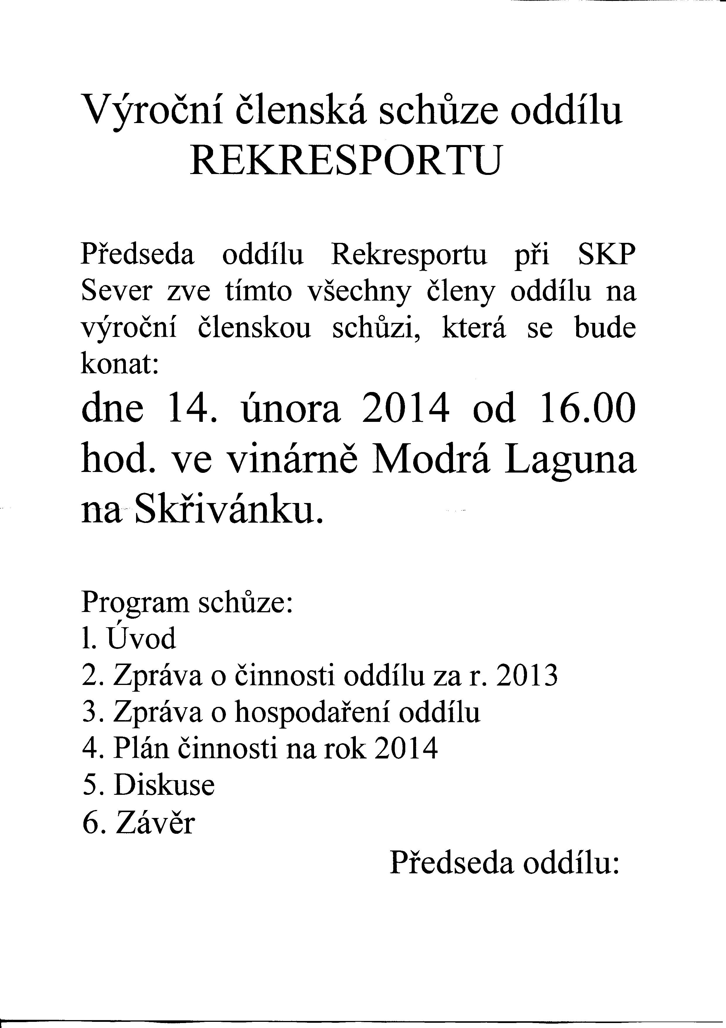 Vzhledem k tomu, že málo členů Rekresportu navštěvuje tyto stránky a o konání schůze se tak nedozví, žádám všechny, kteří se o konání schůze dne 14.2.2014 od 16.00 hodin v Modré Laguně dozvědí, nechť s tím srozumí všechny známé kamarády a kolegy z oddílu Rekresportu. Já to možnost nemám, ztratil jsem kontakty. Děkuji za spolupráci.